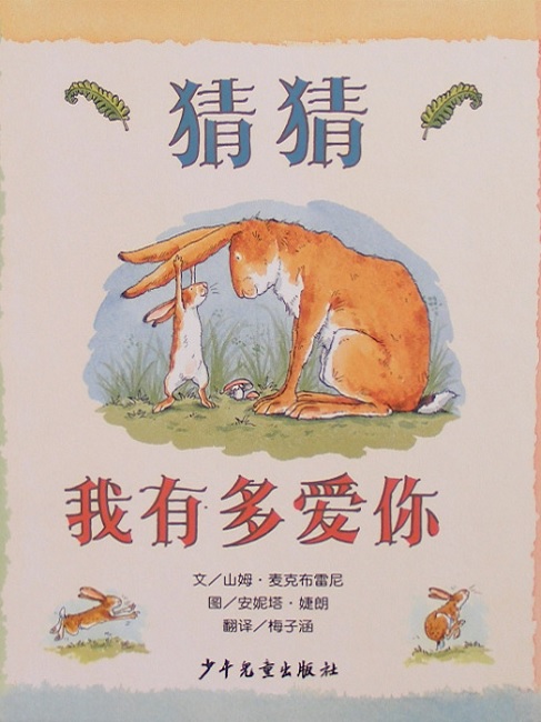 小栗色兔子该上床睡觉了,可是他紧紧地抓住大栗色兔子的长耳朵不放。他要大兔子好好听他说。“猜猜我有多爱你。”他说。大兔子说:“哦,这我可猜不出来。”“这么多”小兔子说,他把手臂张开,开的不能再开。 大兔子的手臂要长得多,“我爱你有这么多。”他说。嗯,这真是很多,小兔子想。“我的手举得有多高我就有多爱你。”小兔子说。“我的手举得有多高我就有多爱你。”大兔子说。这可真高,小兔子想,我要是有那么长的手臂就好了。小兔子又有了一个好主意,他倒立起来···