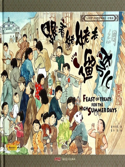 《跟着姥姥去遛弯儿》描绘了50年代北京刚解放时,北京儿童热闹而不失传统风味的夏日生活:三伏天的北京小吃一应俱全,生活气息呼之欲出。 “胖妞!”头伏饺子刚吃完, 姥姥就把胖妞喊。 隆福寺庙会刚开张,凑个热闹,转一转。 “您来啦,里边请。” 胖妞喜欢艾窝窝, 豌豆黄吃了还要驴打滚。